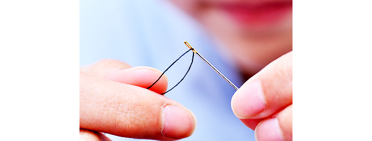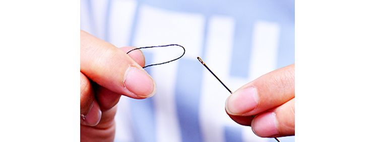 1、左手握针,针鼻向上,右手拿线的一端。