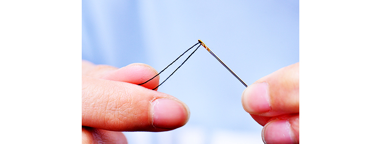 3、右手轻微用力,线经过裂缝进入针孔,轻拉线至所用长度,完成穿线。